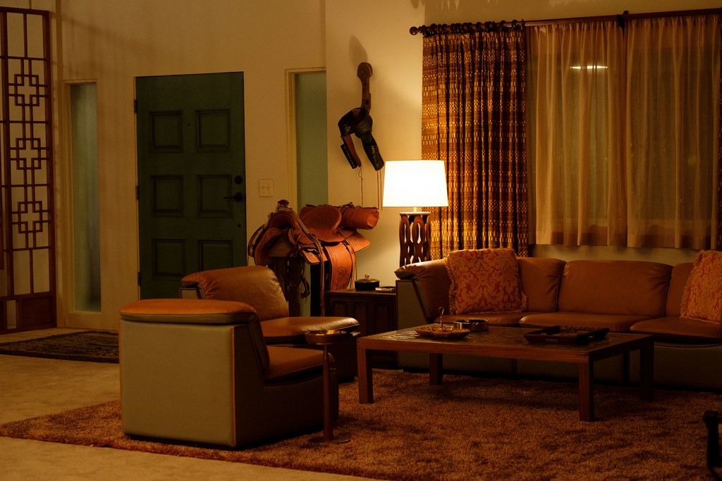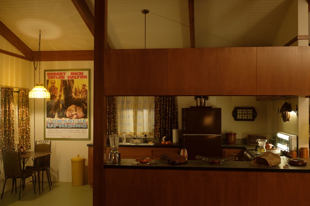 「場景裡的所有東西,都必須考量到他的電視演員生涯。」Ling表示,團隊於棚內打造Rick住家的內部裝潢時,其設計色調主要參考自義大利式西部片,以棕色和芥綠色為主,而四周的電影海報、周邊商品等,也有不少是導演Quentin Tarantino的私人收藏品,讓美術陳設更加真實。