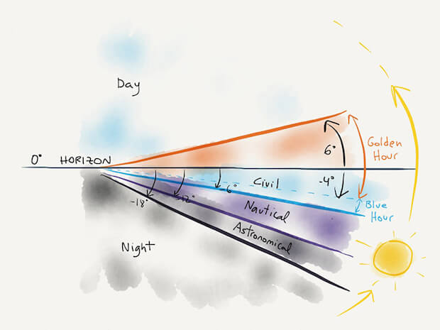 魔幻時刻又可大致分為「黃金時段(Golden hour)」和「藍色時段(Blue hour)」。前者是指太陽落在6°~-4°,光線呈現溫暖柔和的金色調;後者則是指太陽落在-4°~-6°,光線呈現冷調飽和的藍色,而在二者銜接之處,天空會出現藍橙交會的柔美漸層色調。