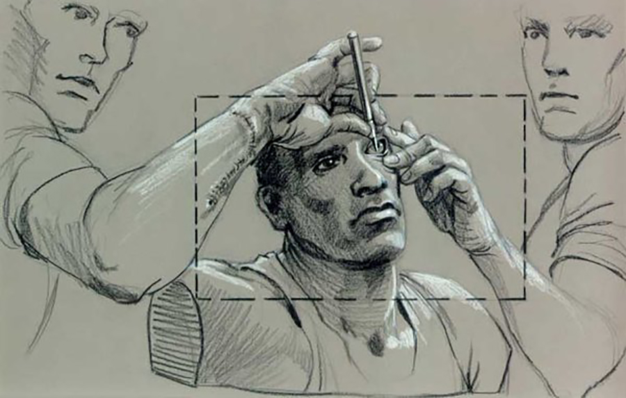 故事板表現出,劇組如何透過演員模型與局部特寫借位,拍攝「挖眼」戲碼