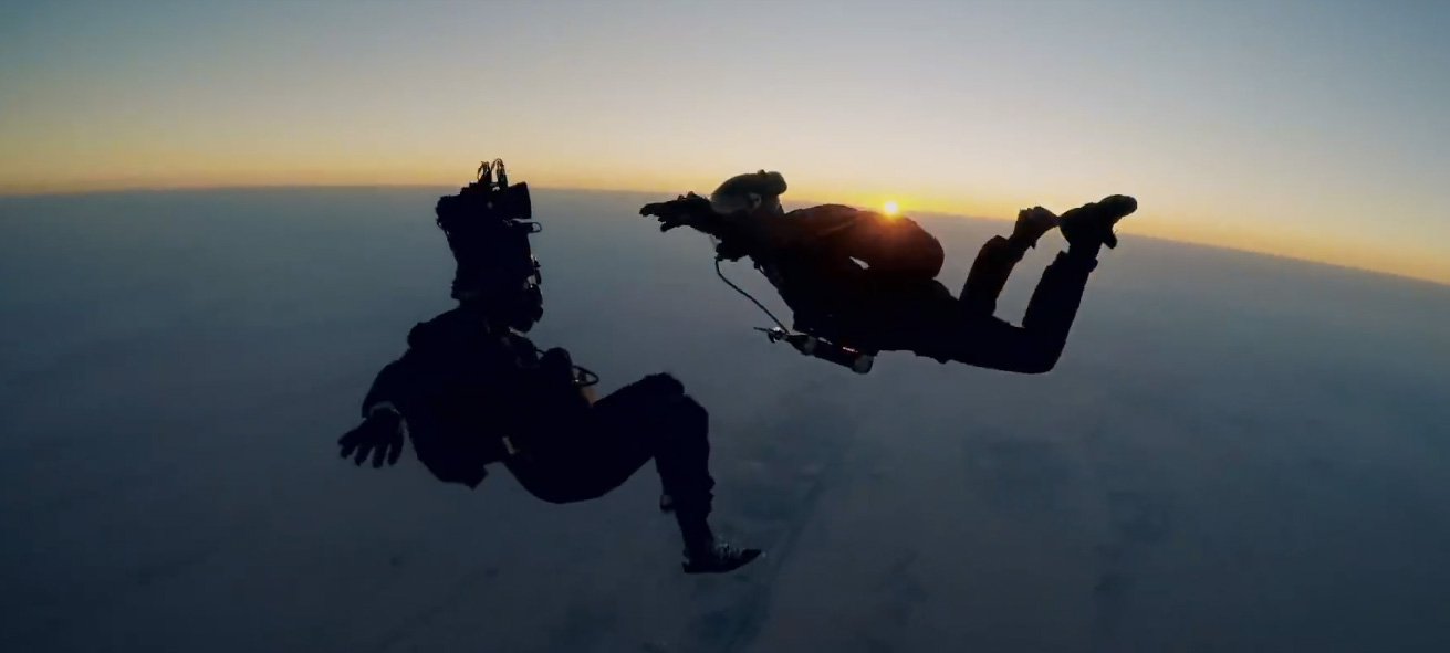 《不可能的任務:全面瓦解》中,其中一段劇情是Tom Cruise與扮演CIA探員的Henry Cavill25000英尺(約7600公尺)高空躍下跳傘。該戲碼的拍攝共分為三段:第一段是Tom Cruise從飛機一躍而下的畫面,第二段是在空中尋找Henry Cavill的身影,再來則是他給予後者氧氣瓶的橋段。