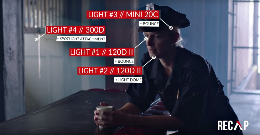 他使用了兩盞 120D II 為主燈,以「反射式打光燈法」(Bounce Lighting)照明,避免在演員臉上產生明顯的陰影;再以 Mini 20C 和反光板,作為演員另一面陰暗處的補光,並將聚光燈照射至背景的煙霧,增添畫面深度與戲劇性,使劇中的人物、情節更顯神秘。