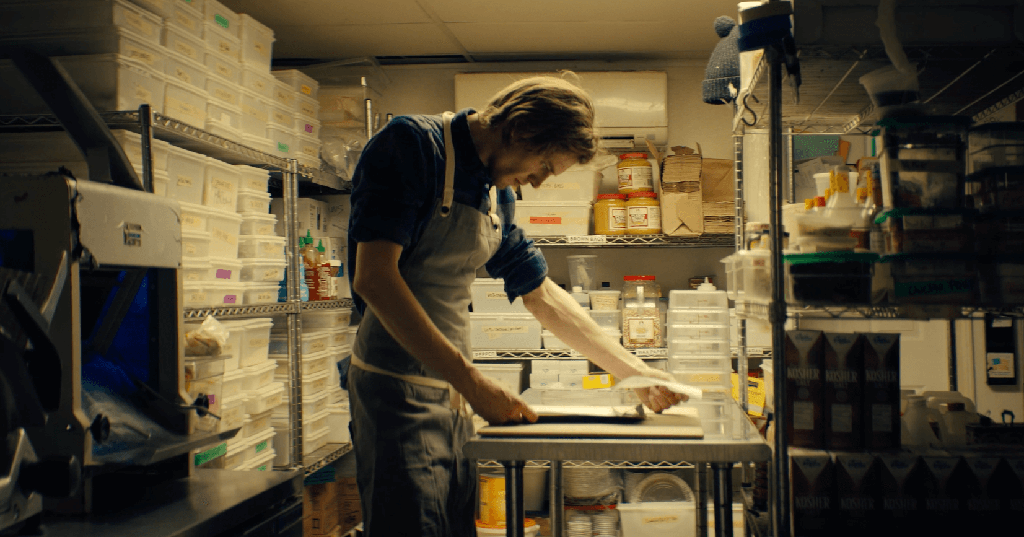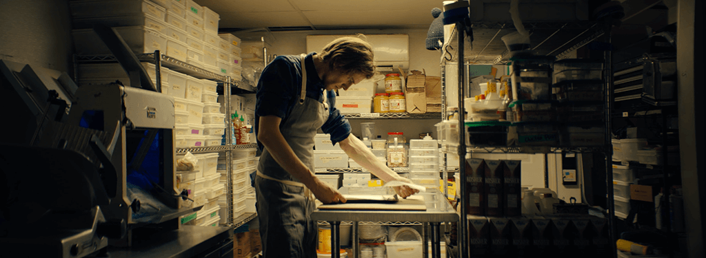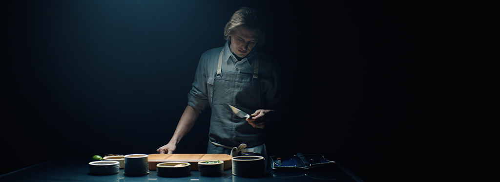 至於食物攝影的光源位置,Kruta 則希望能在片中的黑暗空間上方,模擬一扇透出柔和光線的窗戶,使其不僅可以補足陰影部分的光,也能創造(刀具)反射,凸顯食物的鮮明色彩與可口。