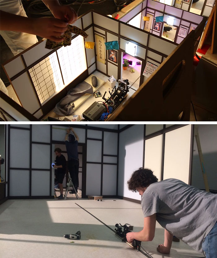 為了使微型相機順利行駛過各間房門,Hudson與攝影指導Ruben Woodin Dechamps經過多番討論,最後決定以低角度拍攝,並進行了許多測試。起初,他們將GoPro放置於木板上,手動推進屋內進行拍攝,但在這麼小的空間內,人力推動相機實在不太方便。因此,他們從日式榻榻米上的黑色線條取得靈感,想出能保持相機直線前進,又能隱藏拖曳線的方法,設計出寬1mm、切至地板中央的「凹槽」來移動相機。