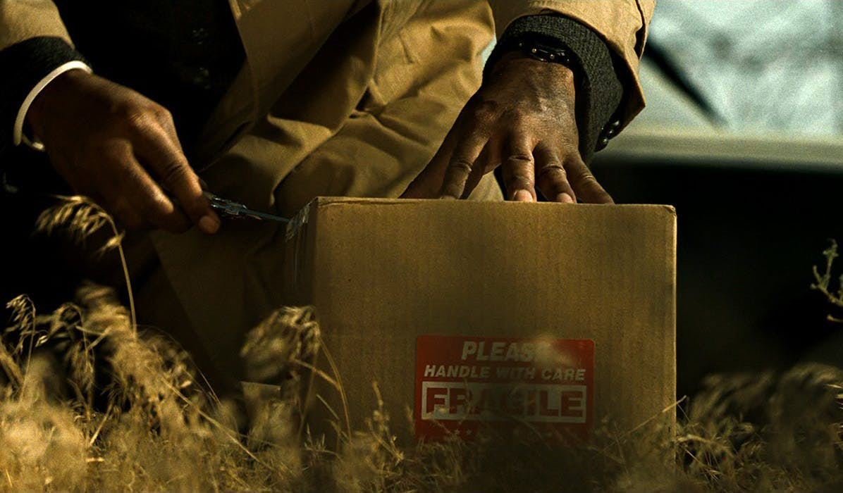 「有人頭的盒子」其實從來沒被拍到內容物,僅透過特寫 Morgan Freeman(摩根費里曼)詮釋警探 David Somerset 打開盒子的神情舉止,與拍攝箱子外側的畫面交錯剪輯,加上殺人犯 John Doe 的台詞,暗示 Brad Pitt(布萊德彼特)飾演的 David Mills(以及觀眾),箱子裡到底有什麼。