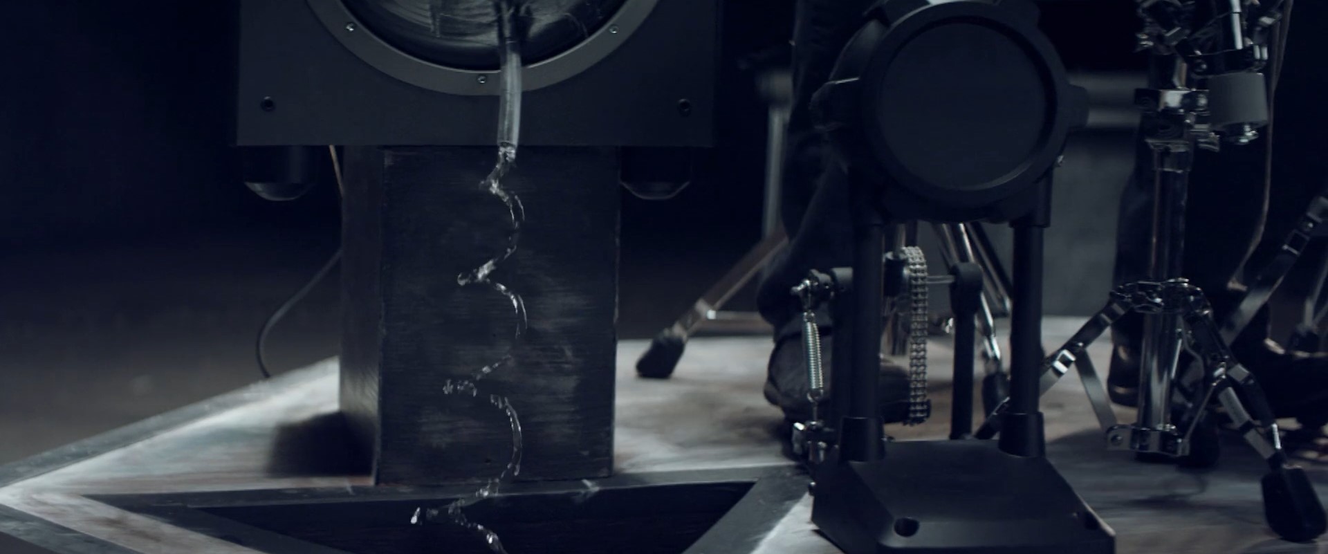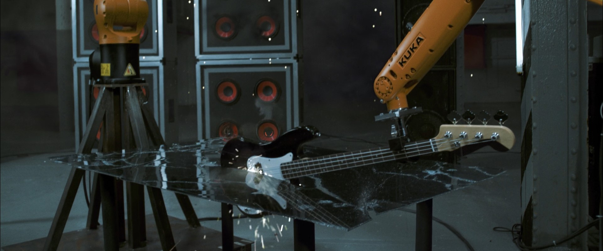 由於機臂無法快速重擊貝斯,拍攝時需先移除桌子,僅拍攝機臂緩慢控制貝斯,移動至地板的畫面;而後再將桌面移回原處,以系簧槍(Captive bolt gun)射擊,並使用Phantom Flex攝影機、以500 FPS捕捉爆破場景,並後製將兩顆鏡頭融合。