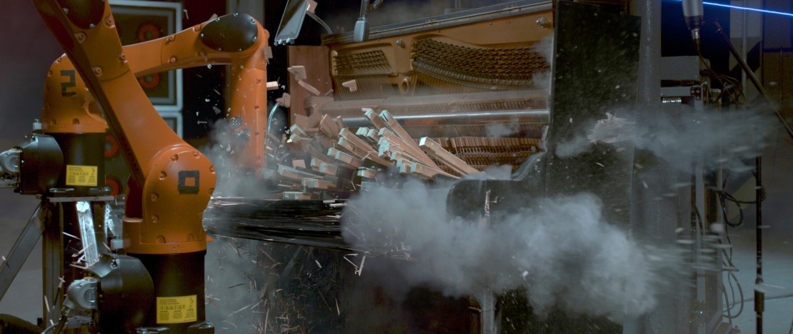 全片同樣以Red Epic Dragon、Phantom Flex攝影機,搭配Arri和Zeiss的定焦鏡拍攝。由於劇組需將三具工業機臂,架設於高腳架上拍攝,僅能設定它們以10至25%的速率演奏,否則恐因重心不穩翻覆,因此攝影指導Timur Civan採取「縮時攝影」手法執行。