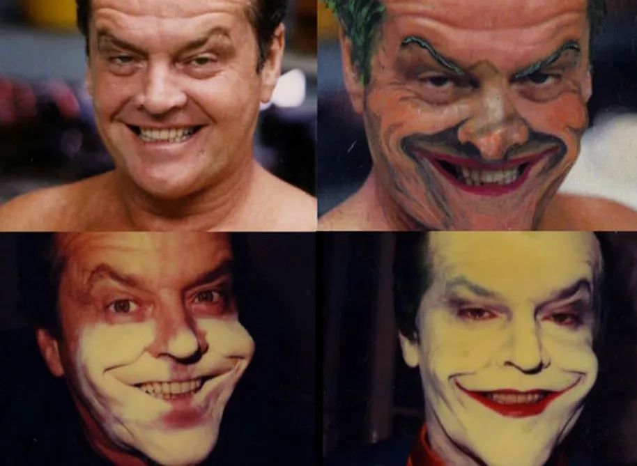 Nicholson 的小丑白皮膚,在電影中是因為意外而變得慘白,因此後來出現的正常人膚色,對小丑而言其實才是「化妝」。小丑擦去肉色妝,顯現白皮膚的效果,Dudman解釋,是在白妝上一層食品級矽膠保護液,再上一層肉色油彩,因此沒有保護液的油彩,可以被浸泡過酒精的手帕單獨擦去。